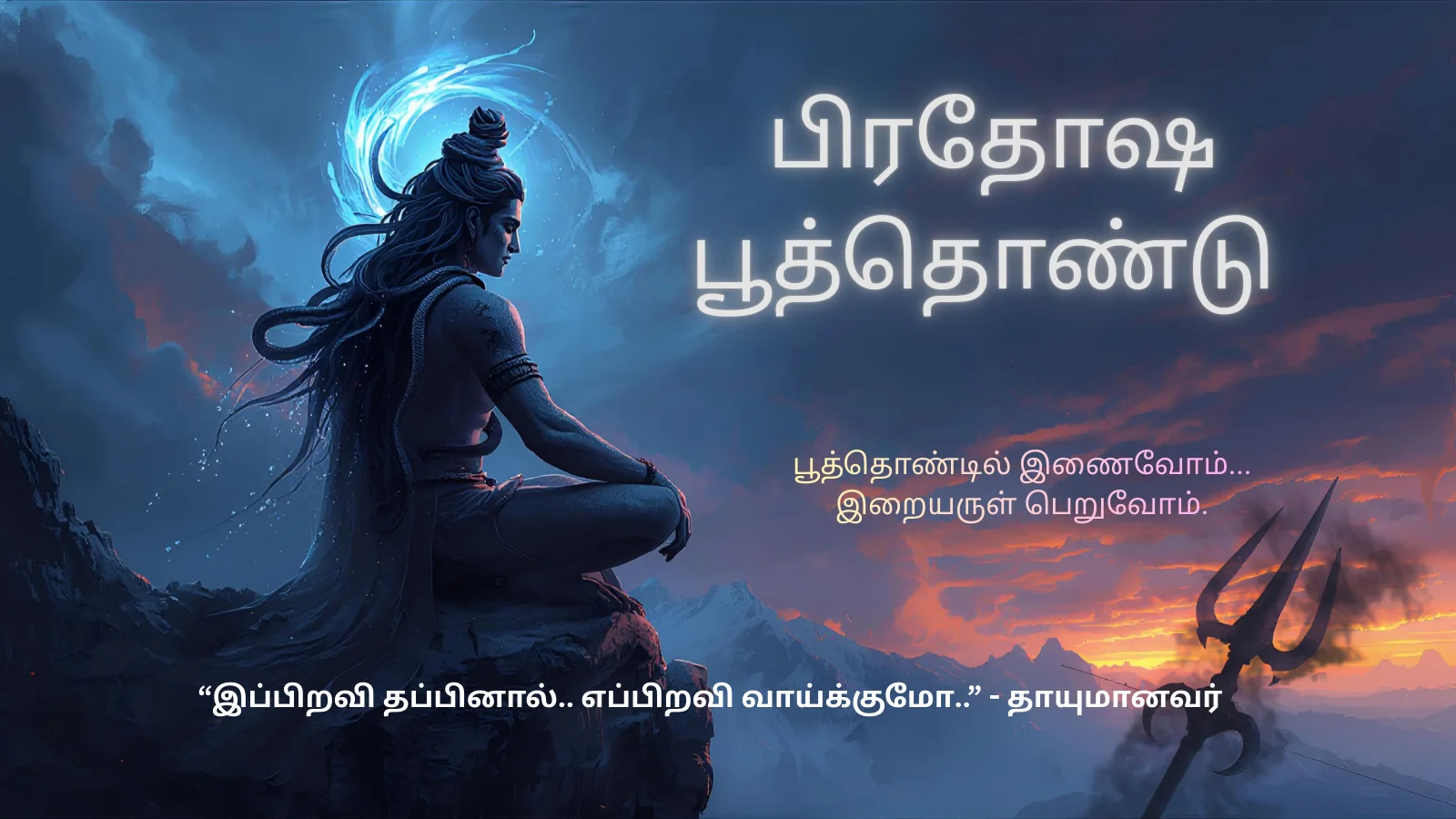 பரபாவ ஆண்டின் முதல் பிரதோஷ நன்னாளில் அனைவரும் எல்லா நலன்களும் வளங்களும் பெற்று வாழ பூத்தொண்டு அறக்கட்டளை எம்பெருமானிடம் விண்ணப்பம் வைக்கின்றது . பூத்தொண்டில் இணைந்து சிவபுண்ணியம் செய்திட வேண்டுகிறோம்.